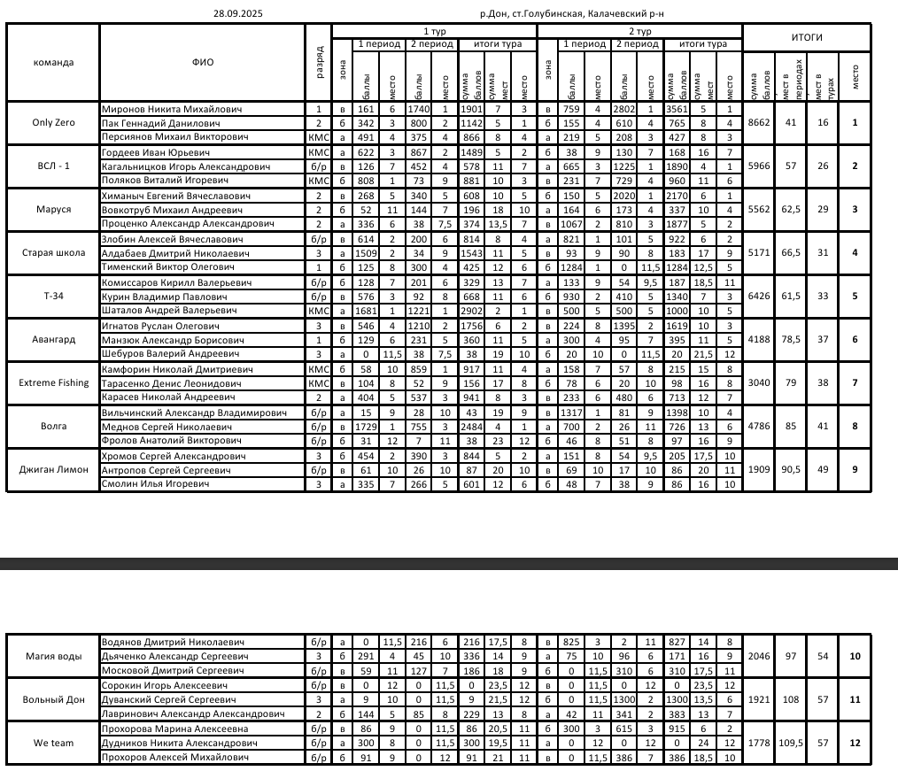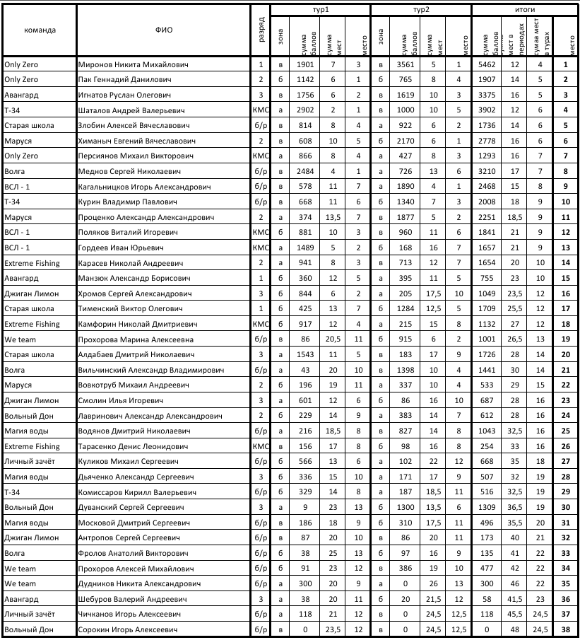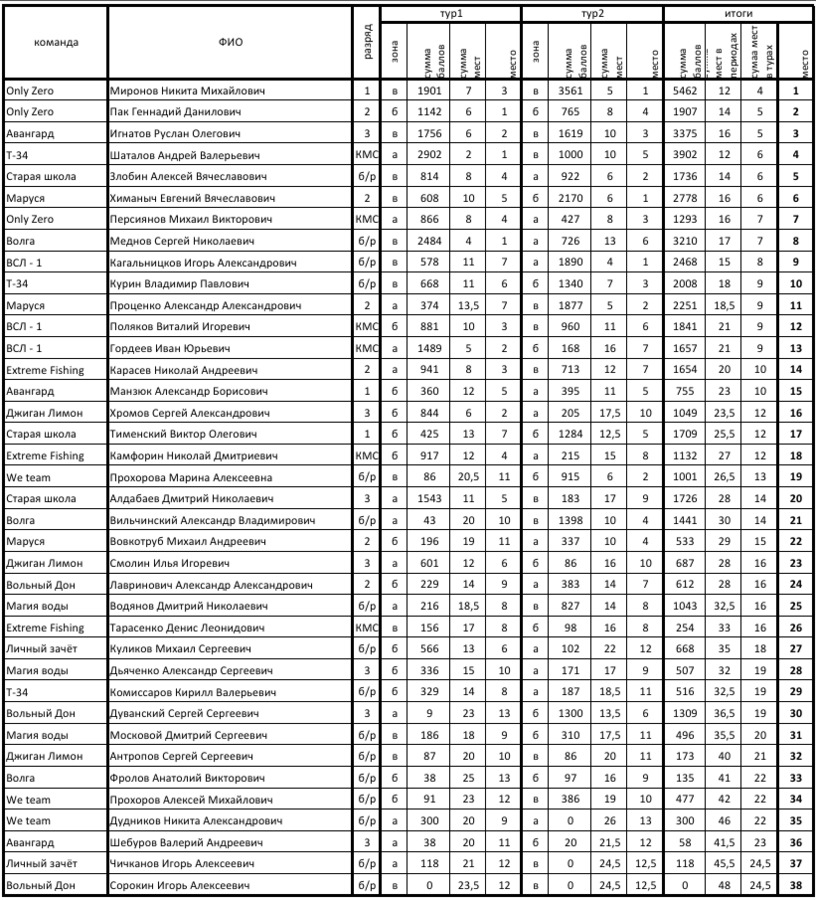 Победители и призеры соревнований определяются в соответствии сдействующими правилами вида спорта "рыболовный спорт". Победителем соревнований признается спортсмен, набравший наименьшую сумму мест за оба тура. Последующее распределение мест в личном зачете осуществляется по возрастанию сумм мест спортсменов по турам. Если у двух или более спортсменов сумма мест по турам одинакова, для определения мест используются следующие критерии (в порядке убывания значимости, каждый последующий критерий используется, если все предыдущие равны): -наименьшая сумма мест, полученная спортсменами во всех периодах обоих туров; -наибольшее количество баллов, полученное спортсменами во всех периодах обоих туров; -наибольшее количество баллов, полученное в одном из двух туров; -наибольшее количество баллов, полученное во втором туре. Если все перечисленные показатели равны, спортсмены распределяются по номеру старта в последнем периоде. Преимущество получает спортсмен, имеющий наибольший номер старта последнего периода. При равенстве всех показателей у двух или более спортсменов, определенных согласно вышеприведенному алгоритму, им присваивается одинаковое итоговое место в турнирной таблице, равное наивысшему из диапазона мест, которые они должны были поделить; места из указанного диапазона, расположенные ниже, не занимаются. Победителем соревнований в командном зачете признаётся Команда, имеющая наименьшую сумму мест, является победителем соревнований. Дальнейшее распределение мест осуществляется по возрастанию указанной суммы мест. В случае, если у двух или более команд вышеуказанная сумма мест одинакова, для распределения мест используются следующие критерии (в порядке убывания значимости, каждый последующий критерий используется в случае равенства всех предыдущих): -наименьшая сумма мест, занятых спортсменами во всех периодах обоих туров; -наибольшее количество баллов, полученных спортсменами во всех периодах обоих туров; -по наибольшему количеству баллов, полученных спортсменами команд в одном из двух туров; -по наибольшему количеству баллов, полученных спортсменами команд во втором туре. При равенстве всех показателей у двух или более команд, определенных согласно вышеприведенному алгоритму, им присваивается одинаковое итоговое место в турнирной таблице, равное наивысшему из диапазона мест, которые они должны были поделить; места из указанного диапазона, расположенные ниже, не занимаются. Итоговые протокол и отчеты соревнований предоставляются на бумажном носителе в ГАУ ВО ЦСП «Олимп» в течение 5 дней со дня окончания соревнований. Итоговые протоколы о проведении спортивных соревнований размещаются: -на официальном сайте федерации http://www.vofrs.ru; -на официальном сайте ГАУ ВО "ЦСП "Олимп" (www.zsp-olimp.ru) в информационно-коммуникационной сети "Интернет"; -в автоматизированной информационной системе "Мой спорт".