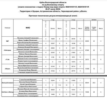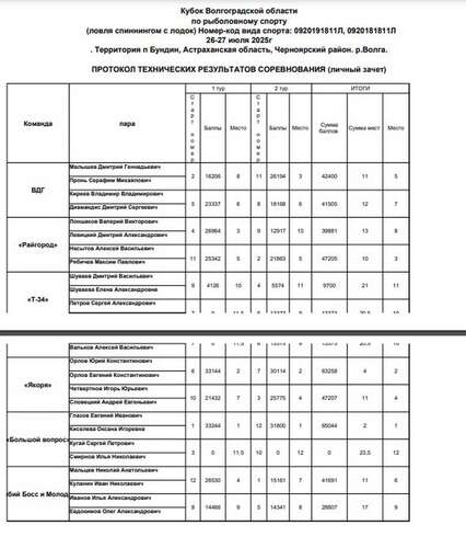 Команда "Спиннингисты" г. Волгоград 1. Иванов Иван Иванович 01.01.1999 г.р., 1 с.р. 1. Петров Петр Петрович 02.02.1999 г.р., КМС. Мотор 50 лс. 2. Сидоров Виталий Иванович 03.03.1999 г.р., 2 с.р. 2. Афанасьев Александр Игоревич 04.04.1999 г.р., б.р. Мотор 9.9л.с.