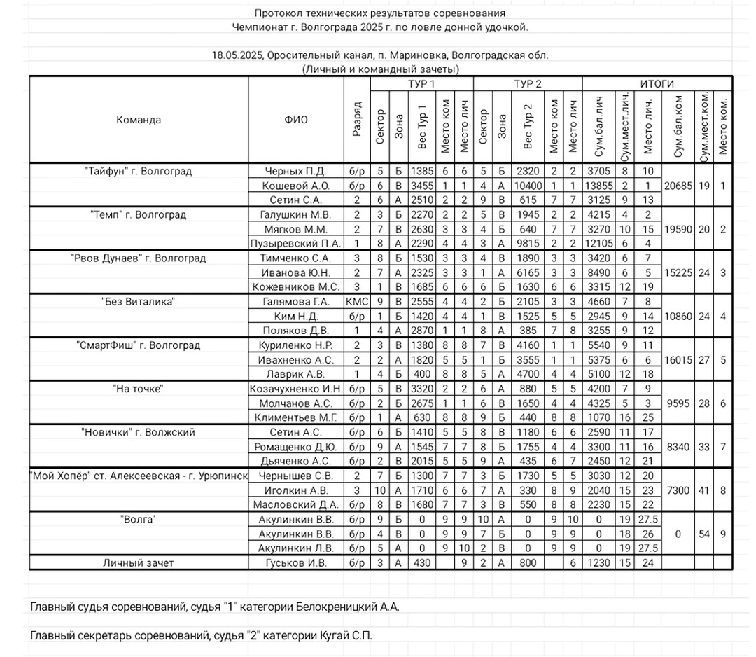 Победители и призеры соревнований определяются в соответствии с действующими правилами вида спорта "рыболовный спорт". Победителем соревнований в личном зачёте на соревнованиях в два тура признаётся спортсмен, набравший наименьшую сумму мест (очков) за оба тура. Последующее распределение мест между спортсменами в личном зачёте осуществляется исходя из суммарного количества мест (очков) каждого спортсмена. Спортсмен, имеющий меньшее количество очков, занимает более высокое место. В случае равенства суммы мест (количества очков) у двух или более спортсменов преимущество при определении более высокого места отдается спортсмену, имеющему наибольший вес улова за два тура (наибольшее количество баллов). В случае равенства веса уловов (количества баллов) у двух или более спортсменов преимущество при определении более высокого места отдается спортсмену, набравшему большее количество баллов во втором туре соревнований. Победителем соревнований в командном зачёте признаётся команда, имеющая наименьшую сумму мест (очков), набранных спортсменами этой команды в обоих турах соревнований. Последующее распределение мест между командами в командном зачёте осуществляется исходя из суммарного количества мест (очков) спортсменов каждой команды. Команда, имеющая меньшее суммарное количество мест (очков), занимает более высокое место. В случае равенства суммарного количества мест (очков) у двух и более команд преимущество при определении более высокого места отдаётся команде, имеющей наибольший вес уловов, пойманных спортсменами этой команды за оба тура (спортсмены которой набрали наибольшее суммарное количество баллов). В случае равенства суммарного веса уловов (количества баллов) за два тура у двух или более команд, преимущество при определении более высокого места отдаётся команде, спортсмены которой имеют наибольший вес уловов (набрали наибольшее суммарное количество баллов) во втором туре соревнований. В случае равенства у двух или более команд и этих показателей, наивысшее место присуждается команде, спортсмен которой имеет наибольший вес улова в любом туре соревнований. Итоговые протокол и отчеты соревнований выкладываются на сайте http://www.vofrs.ru в течение 14 дней со дня окончания соревнований. Итоговые протоколы и отчеты соревнований предоставляются на бумажном носителе в комитет по физической культуре и спорту администрации Волгограда в течение 3-х дней со дня окончания соревнований.